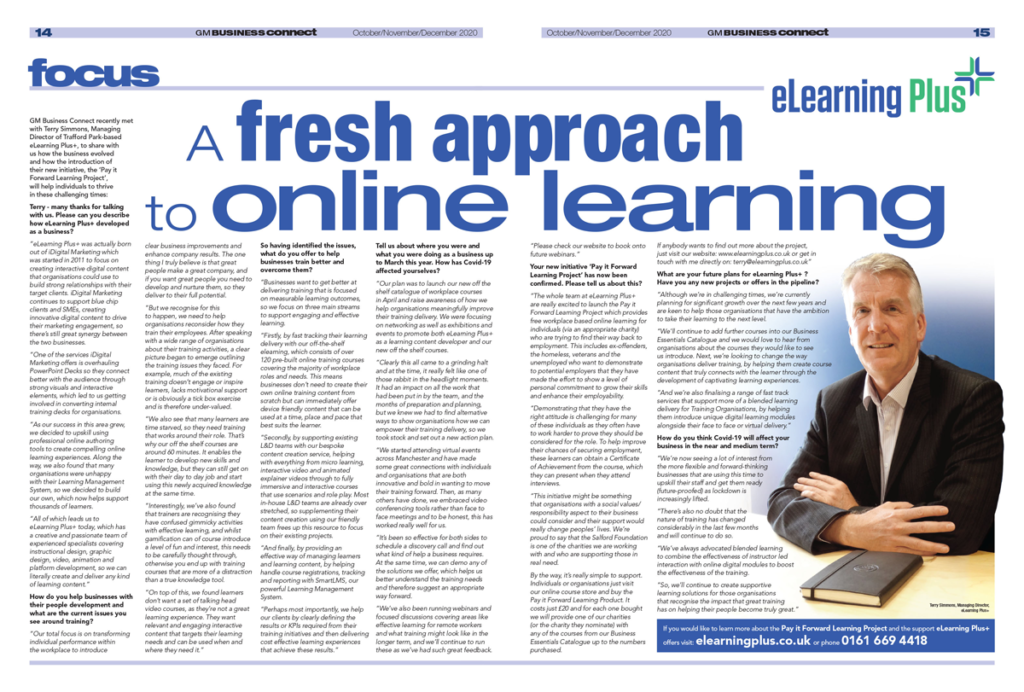I was recently asked to share with the Greater Manchester Business Connect Magazine how eLearning Plus has been coping with COVID and how the introduction of our new initiative, the ‘Pay it Forward Learning Project’, will help individuals to thrive in these very challenging times. You can read the Article by clicking the link below: