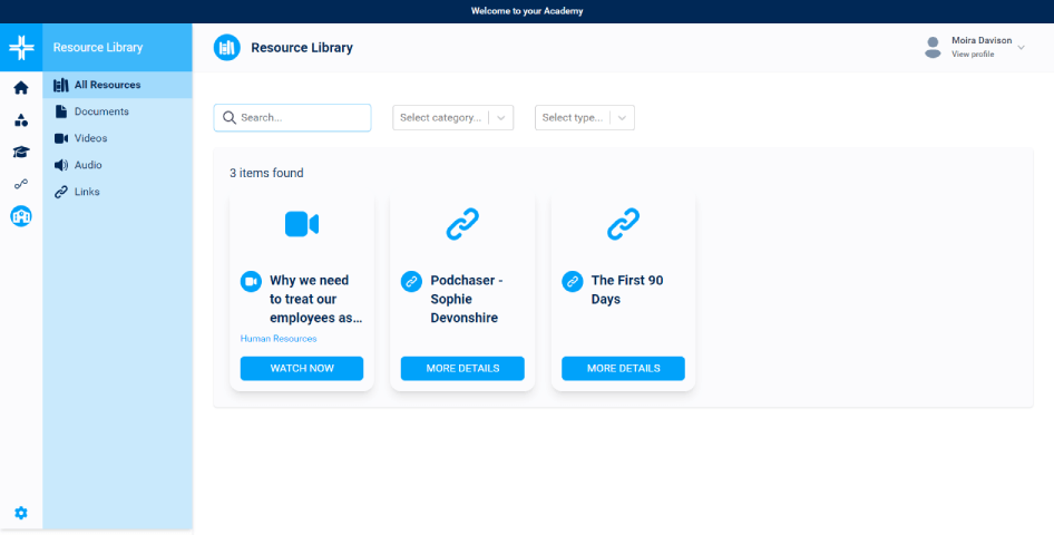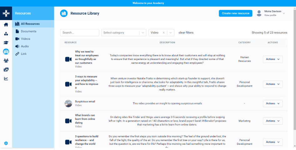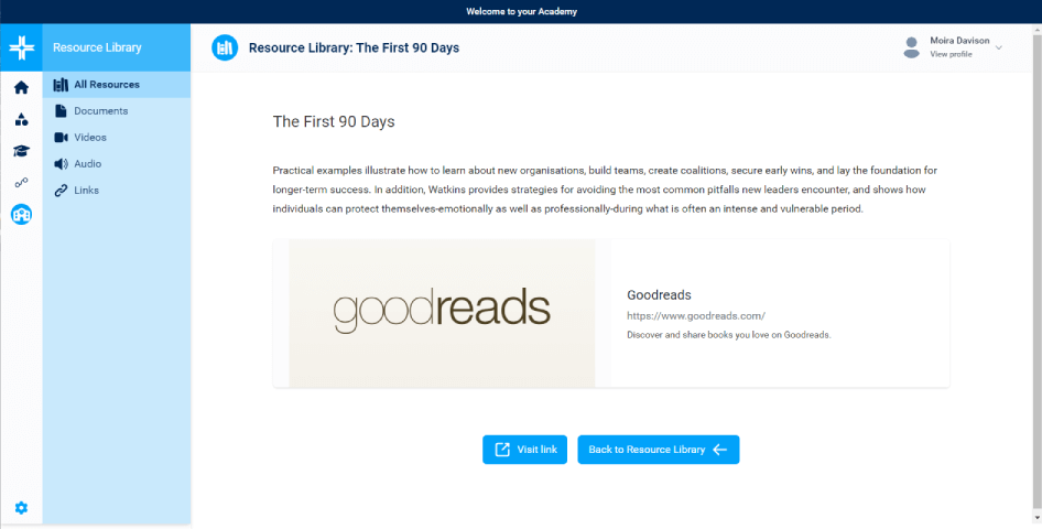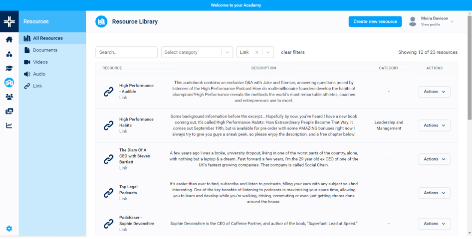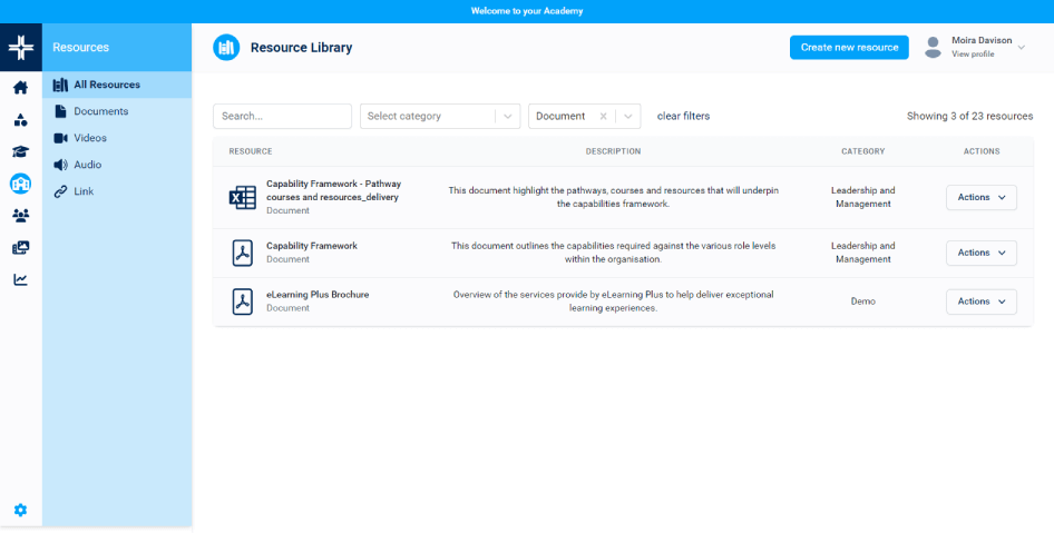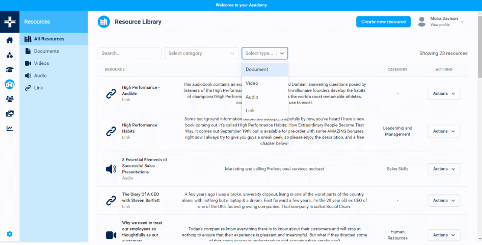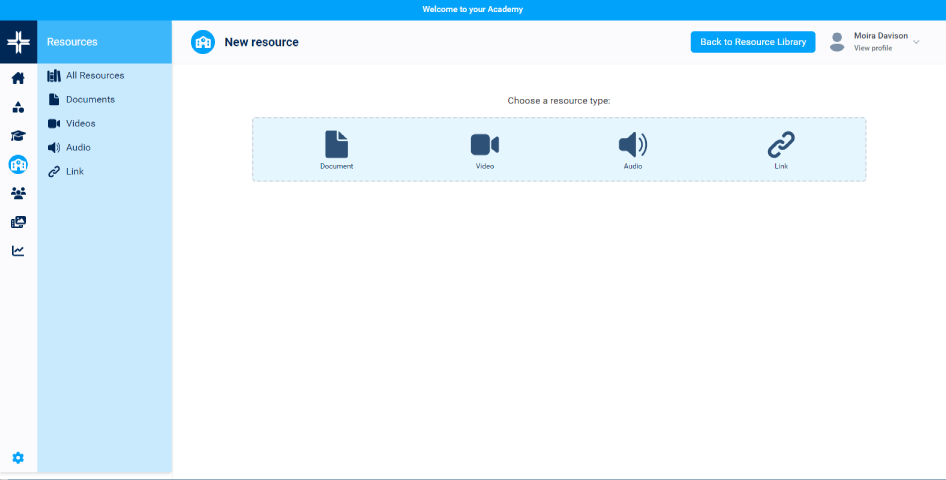 An integrated resource library for adding a range of learning resources, including video, audio, web links and documents/files