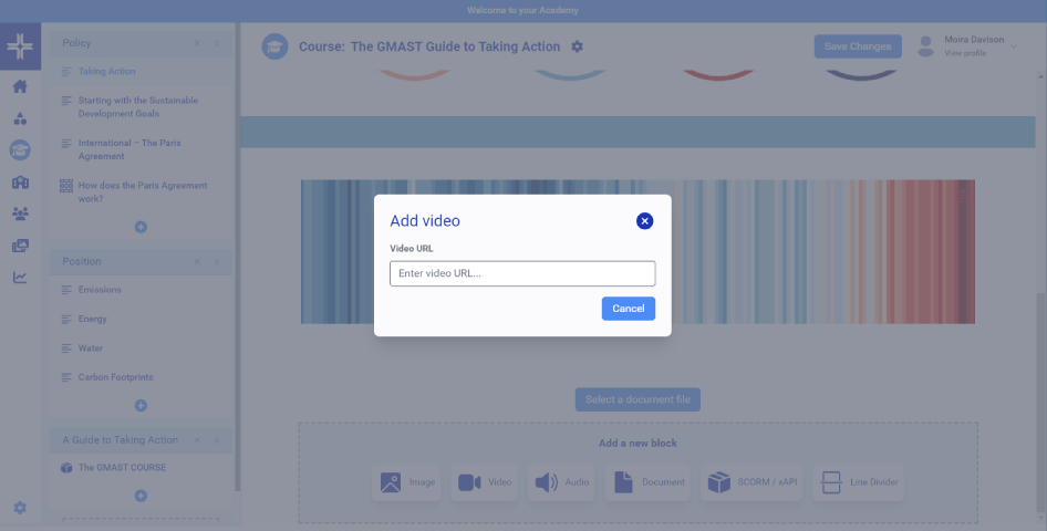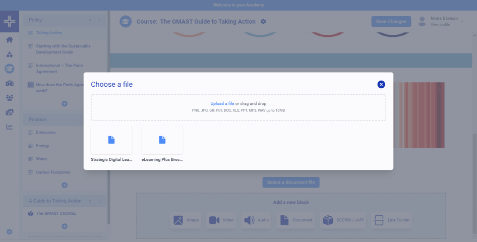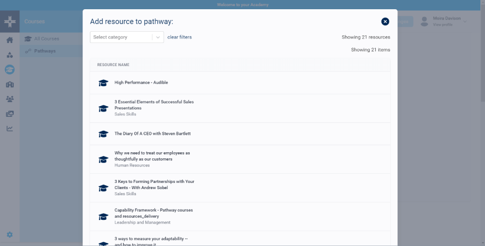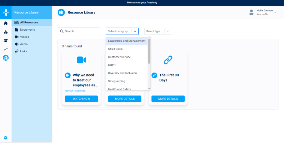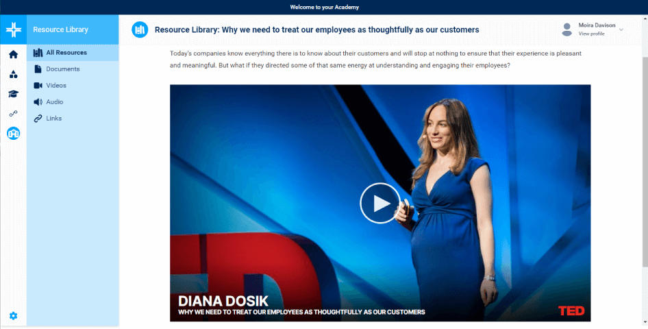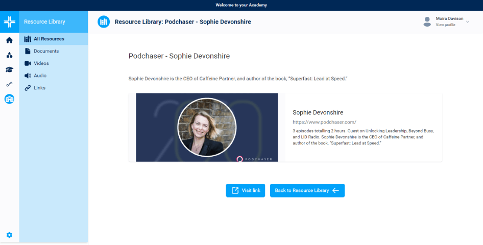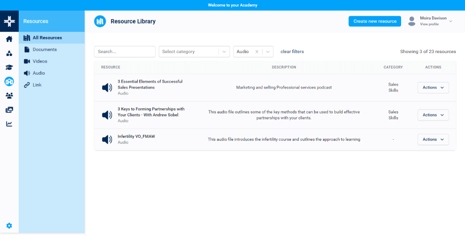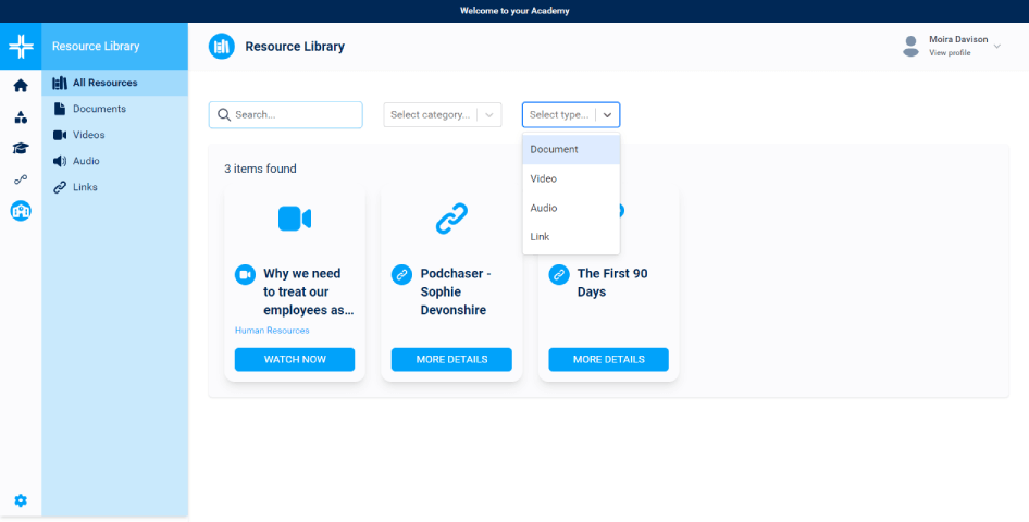 An integrated resource library for adding a range of learning resources, including video, audio, web links and documents/files