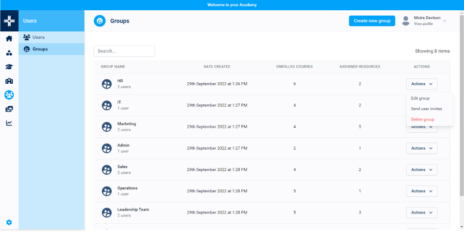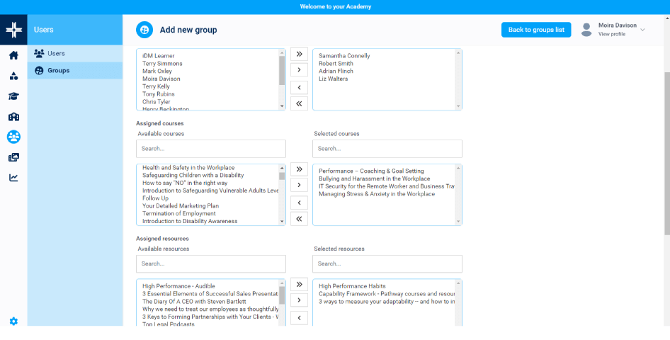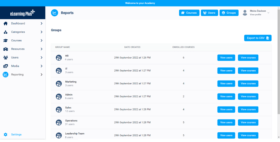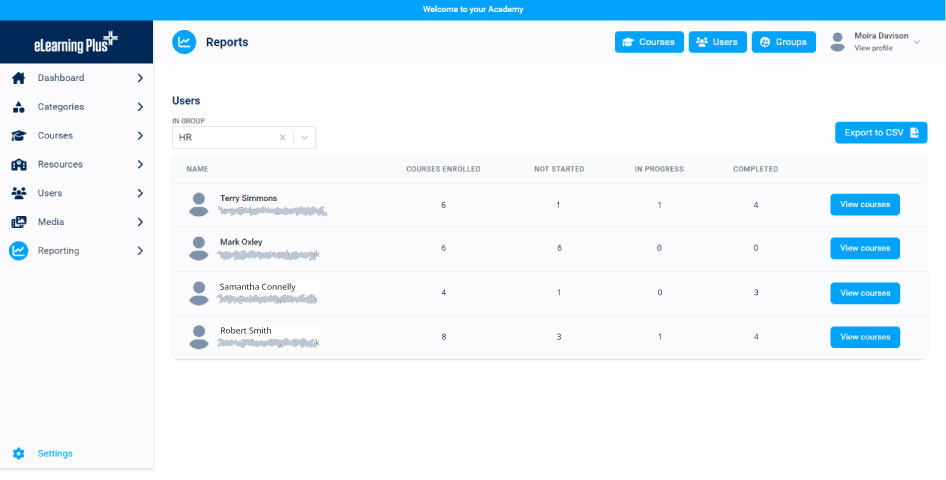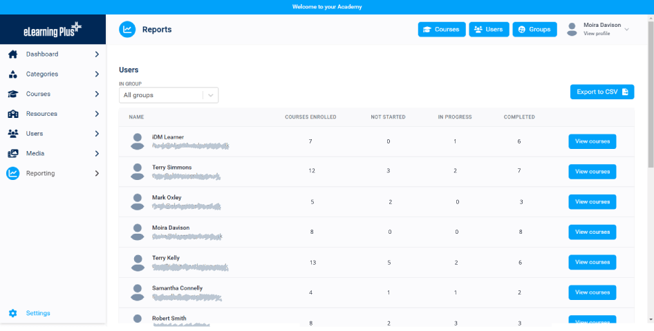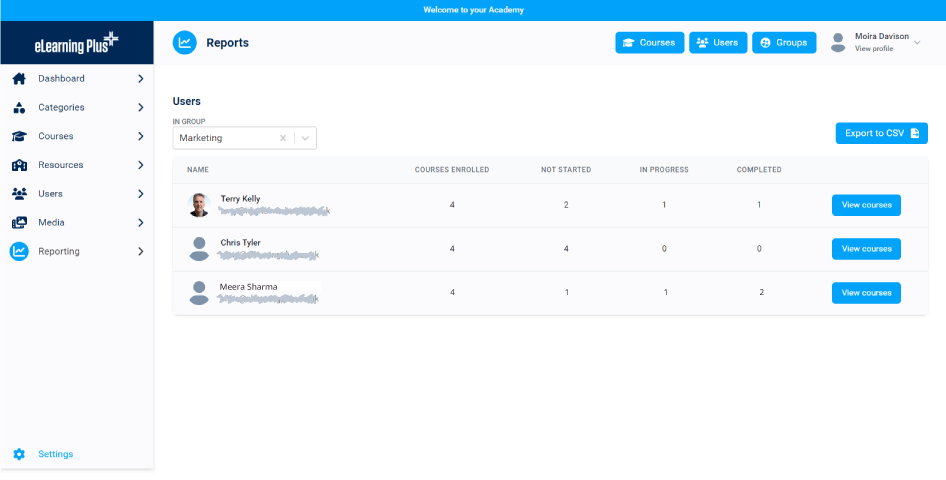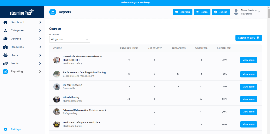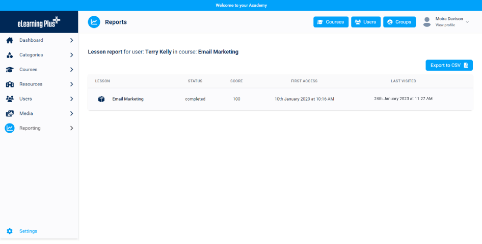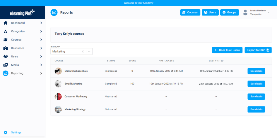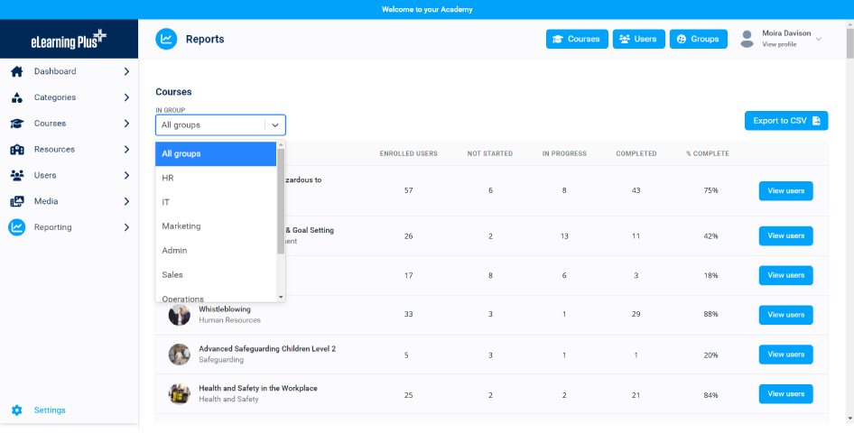 Measurement and reporting for courses, resources, groups and users to provide valuable insights and review learner progress